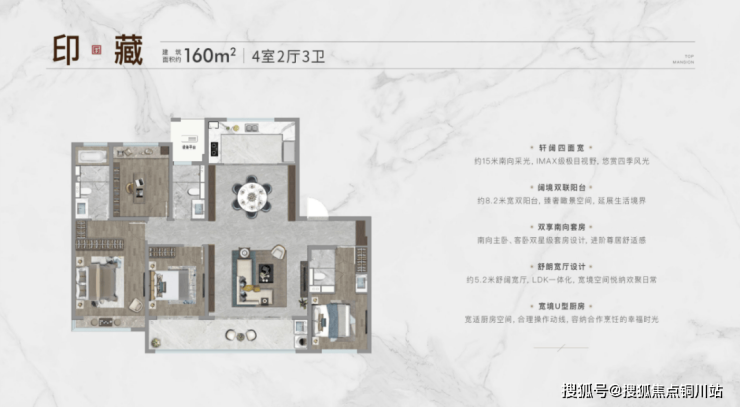 建面约160㎡,4房2厅3卫: 同样是四开间朝南设计,大横厅设计,尺度感满满,南北通透。