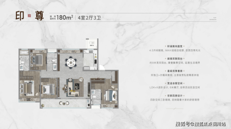 建面约180㎡,4房2厅3卫: 4.5开间朝南,阳台达到惊人的9米,不得不说尺度够阔绰。南向客卧套房设计,收纳也更从容。