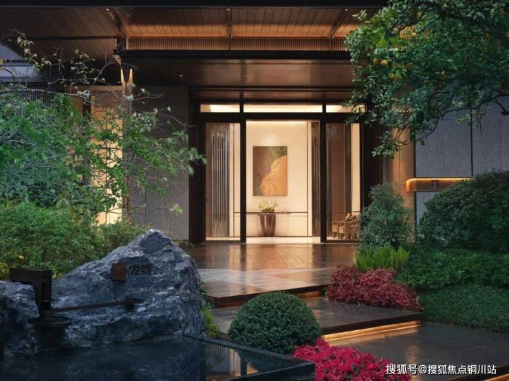 走进社区,新中式美学的质感扑面而来。项目以“诗意东方”为魂,通过“三进门庭”的空间礼序和“游湖六境”的意境营造,勾勒出沉浸式东方人居场景。入口大门处的罗汉松苍劲挺拔,与“水境花林—碧波云亭—闲庭碎影”的三重归家序列相映成趣,叠水潺潺淌过石阶,乌桕疏影横斜,亭台枕水而立,仿佛穿行于一幅流动的山水画卷。