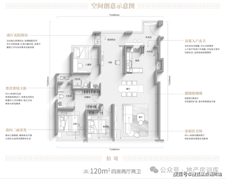 建面约120㎡面积段户型,从三房升级到四房,还叠加了入户花园、大横厅、LDKB、家政空间等功能。
