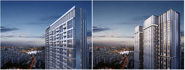 在外立面的材质选择上,参考了新加坡的Marina Bay (世界最昂贵酒店之一) 及美国哈德逊河畔的高端住宅,选用了大块铝扣板作为外立面主要材质,更加耐用,防风耐腐蚀,稳定性更高,保证了多年后整栋楼依然如新。