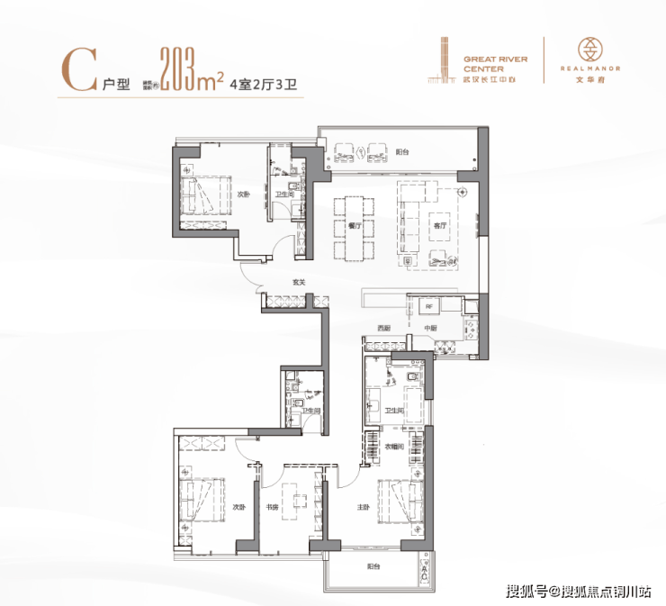 起步约203㎡左右的户型,本来就比别家“大一size”。超大开间的观景阳台,酒店套房般的主卧,更有南北双阳台设计。