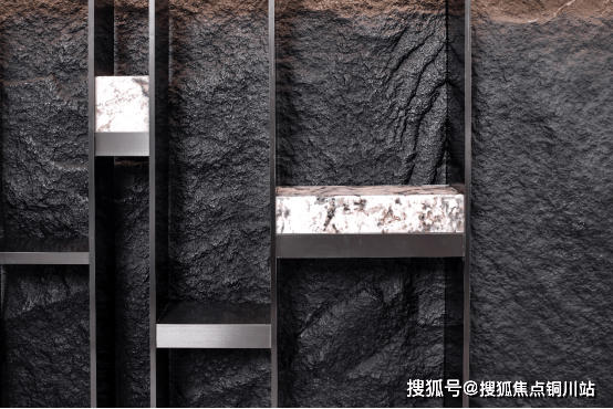 客厅一侧的山西黑大理石装饰面,大气厚重,天然石材的肌理和厚度,搭配金属边框和雪山银狐的透光石的点缀,营造出隐贵的气质。