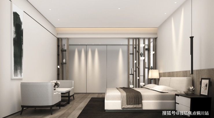 为了更显私密,主卧门口还设置了一个小玄关,方便陈列一些主人珍藏的手办或是古董,或正好用来展示墨镜、手表、首饰等,还巧妙的将洗浴与休息分开。