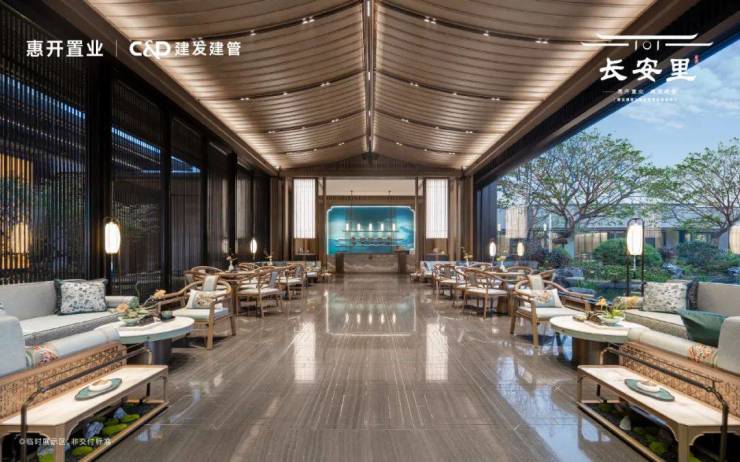 站在售楼处约9.6米宽、约3.5米高的落地窗前,错落有致的亭廊和山石叠水相互交织,宛如徐徐展开的山水画卷,在这喝一杯茶,江南诗意生活尽显。