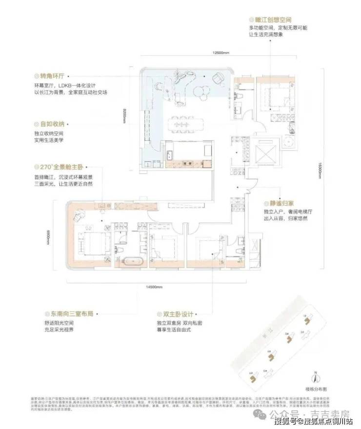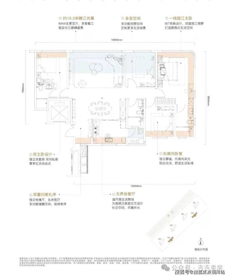 户型:3+X室2厅3卫,约16.2米的瞰江面宽,客厅、主卧、次卧、X空间四个功能区能同时享受无遮挡江景。全景无立柱设计,让江景从地面一直延伸到了天花板,而且可以根据需求调整沙发朝向!
