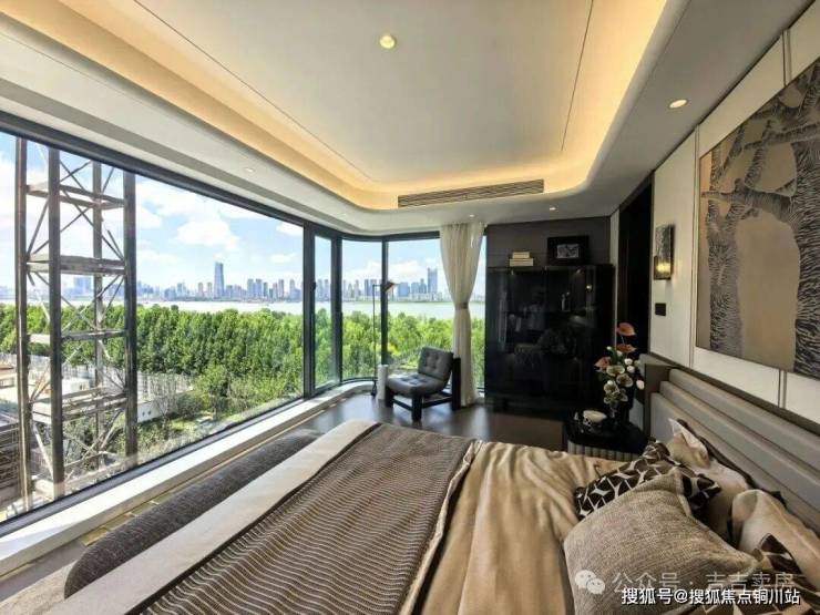 主卧270°U型环幕视野,用三面玻璃幕墙构建了一个悬浮于江面上的观景台。
