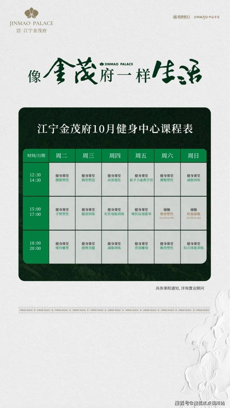 更值得强调的是,业主“前脚”签约,“后脚”就能体验服务。根据10月会所运营课程表,周二到周日,业主可选择游泳、瑜伽、尊巴、减脂训练等丰富课程。谁看了都得感慨,江宁金茂府的业主也太幸福了!
