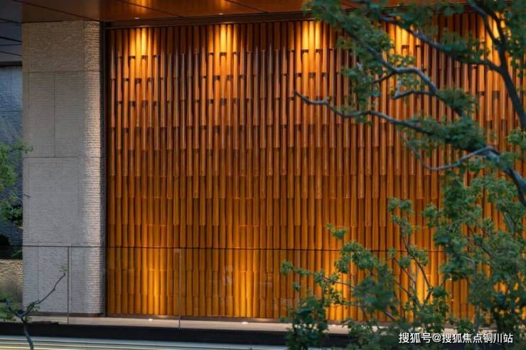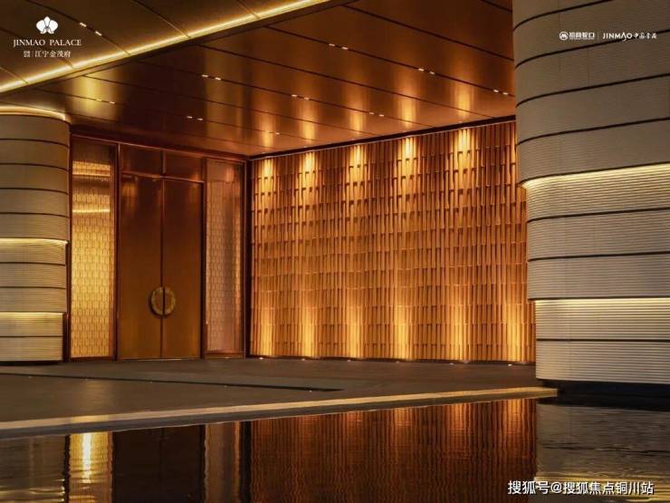 更值得细品的,是材质的选择。不同于南京楼市常见的石材立面,江宁金茂府的大门景墙,是由釉面陶板打造而成,两侧和檐口是定制纹理陶板。