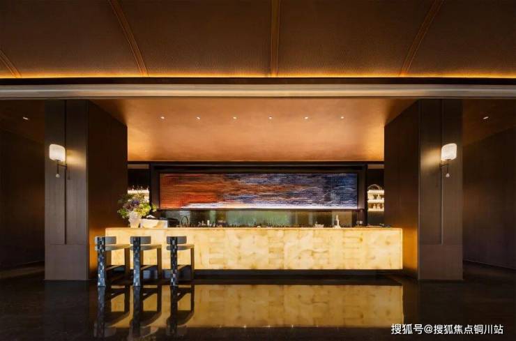 如果不告诉你,你能猜到这是行政酒廊吗?参考香港丽晶酒店,江宁金茂府巧妙运用红宝石透光石材,搭配艺术玻璃、深色木饰面、动态金属等,光影流动间尽显浪漫与奢华。
