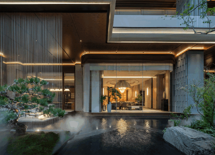 为致敬流传千年的竹韵,在临溪约12米高“经纬光厅”中,江宁金茂府以陶筒仿竹节竖向拼贴,呈现独特优雅的意境。不禁想象:静夜无声,满月悬于藏青天幕,月光从“竹节”间隙洒落,静静映照溪流与夜空。此刻此境,已是人间清欢。