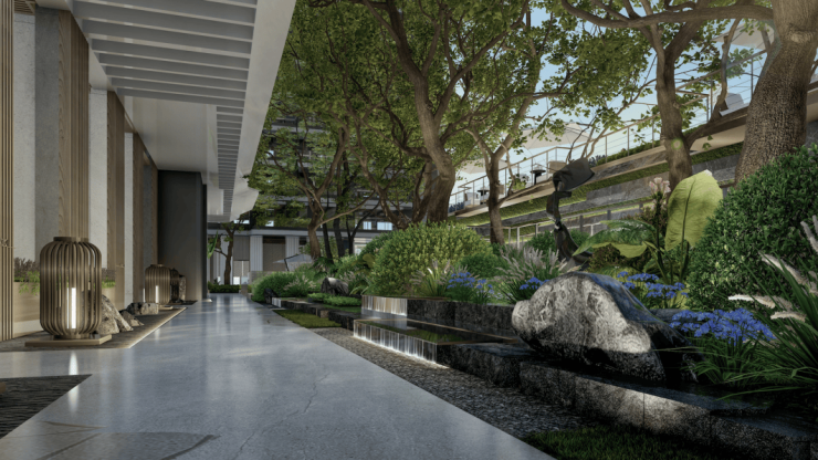 项目以大师手笔匠造立体景观园林,搭配半围合的布局以及内部层峦叠翠景观绿植。游走其间,仿佛置身于天然的山体公园中,所谓世外之境,也不外乎如此。