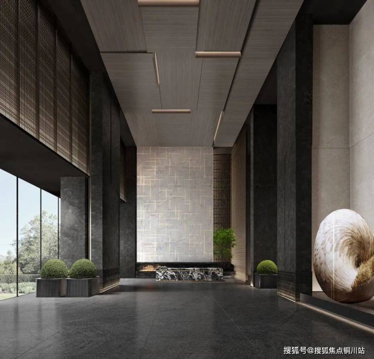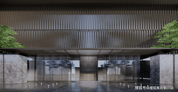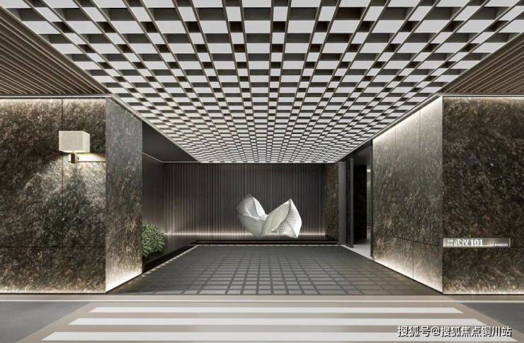 武汉101的大门两侧是,爱马仕灰天然石材铺贴的墙面,中间是定制纯铜岩板,顶部是蓝灰色、高反玻璃搭配古铜拉丝的金属格栅。它将是武昌“第一豪门”。
