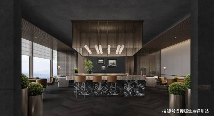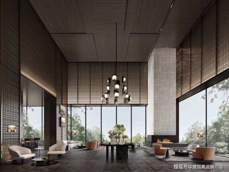 墙面、前台、石柱、迎宾景墙等用了宝格丽黑奢石等全球7大奢石,堪称一座奢石博物馆。大堂吧里家具与奢华酒店公区同款,吊灯全部是西班牙进口高定艺术吊灯。