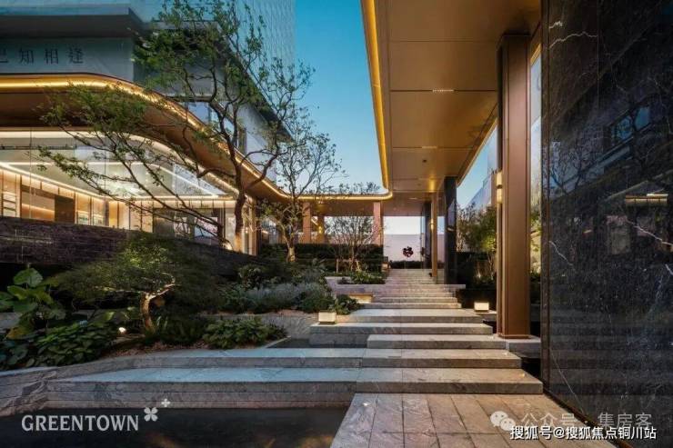 主入口知·云栖,取意西湖十景以"洄游"为理念,超52米跨度的回字形布局,重构传统"四水归堂"空间序列,约2.4米“流光礼宾” 塔冠,如悬浮的美学灯塔,与金色挑檐相映成辉,全封闭式阳台勾勒建筑轮廓,让立面如镜幕般收纳约30公里江岸鎏光!