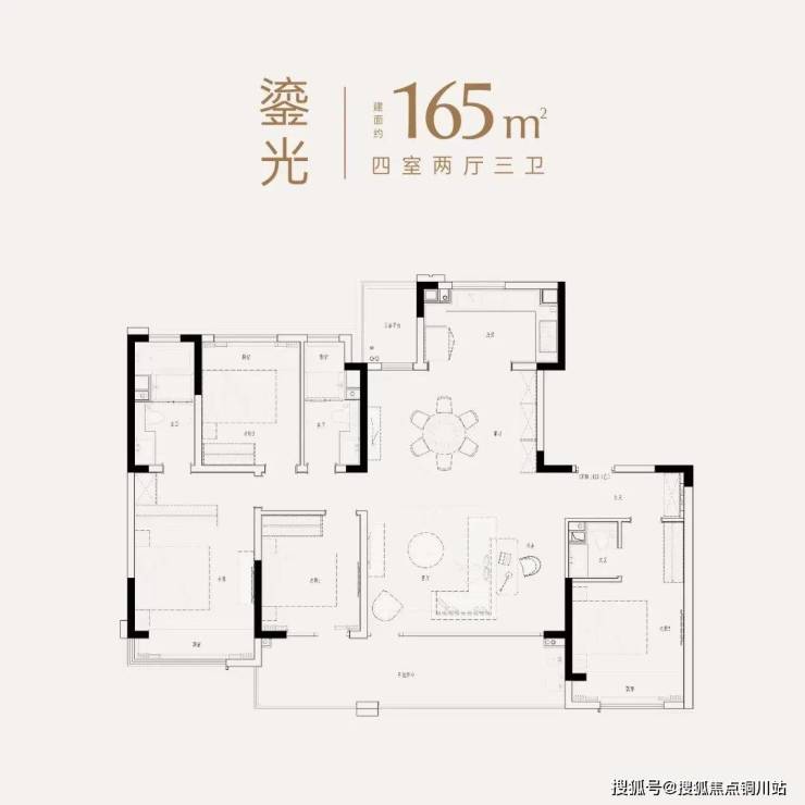 建面约165㎡户型,四房两厅三卫布局,采用LDKB一体化设计,支持多种场景切换,满足家庭聚会、居家健身、儿童活动等多类需求。