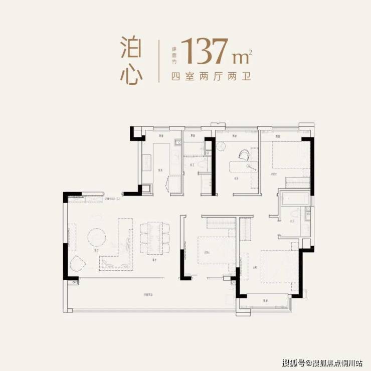 建面约137㎡户型,四房两厅两卫设计,客厅采用黄金面宽进深比,打破传统竖厅边界,实现餐客一体化设计。