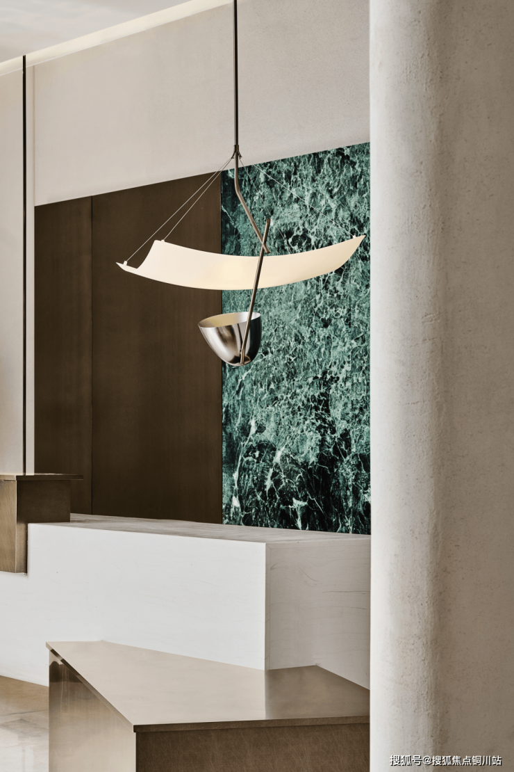入口处正对接待空间,空间以弧型的界面划分,给空间以围合感,接待背景弧型白色肌底上嵌入绿色的天然大理石作为背景点缀,同时也极具有当代感的体块结合。