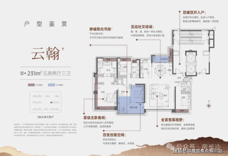 5房2厅3卫,双梯双开入户,南北通透,带中西厨房,空间尺寸更为富余。