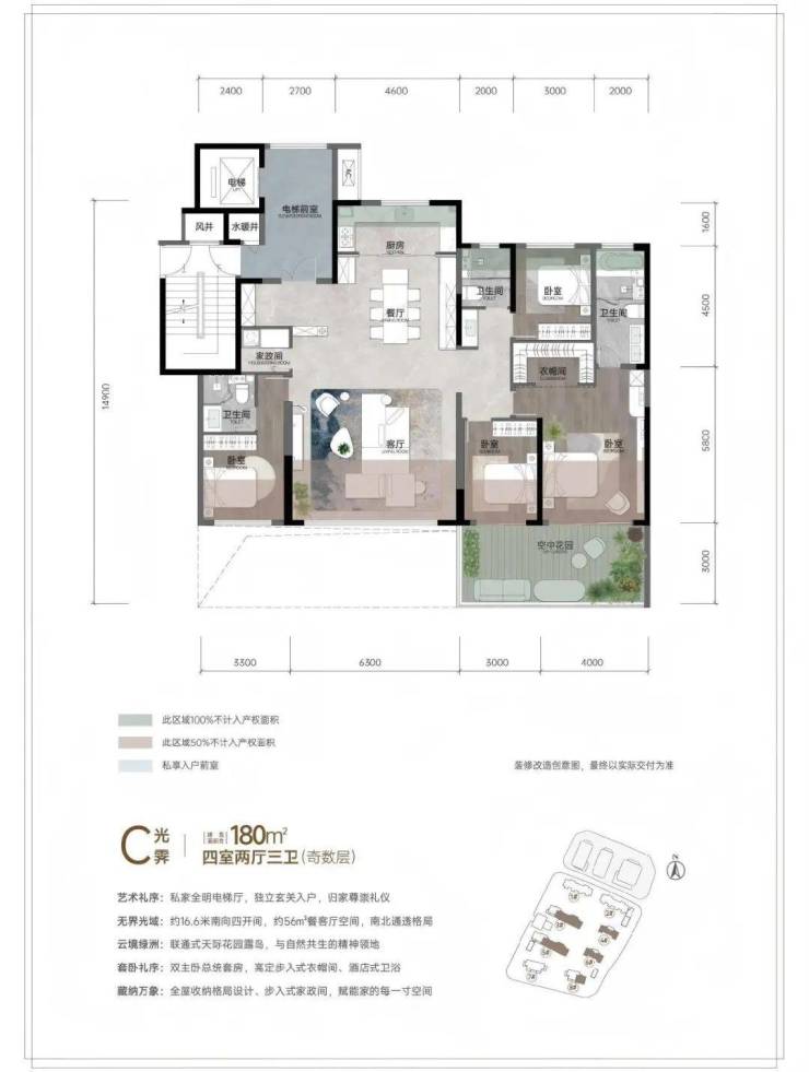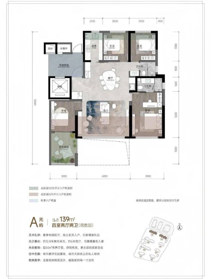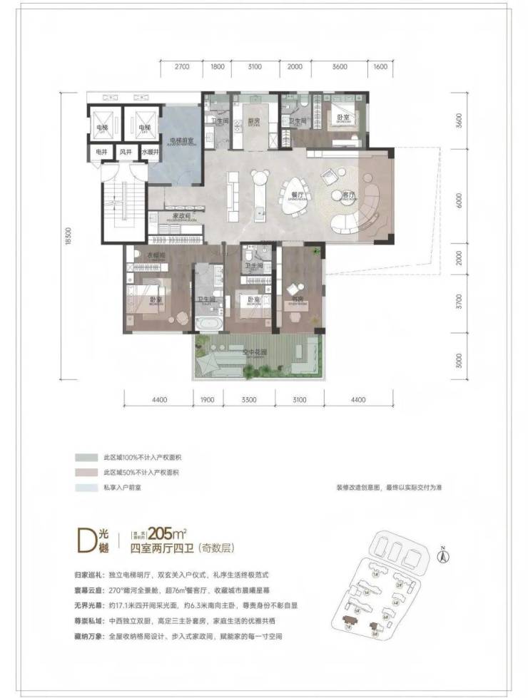 步入室内,全赠送的景观阳台犹如天然的生活延伸带,既可打造为空中花园,也能化身阳光茶室。飘窗经过巧妙改造,成为兼具收纳与休憩功能的私密角落;露台的扩容设计,让星空晚宴、家庭聚会拥有专属场地;私家电梯厅则带来尊崇归家体验,灵动空间更可根据家庭需求自由变换为书房、儿童房。