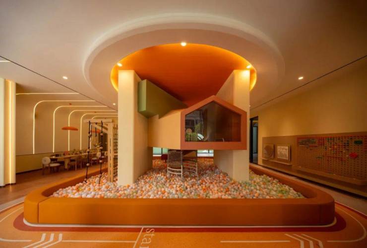 中心花园贯穿东西,引灵江之水为意,浮山屿之形为境,那漂浮的泳池成为视觉焦点与休憩胜地。社区充分考虑家庭需求,为孩子们打造了多层次的探索天地。分龄设计的活动区充满巧思,延展出一幅的理想生活长卷。