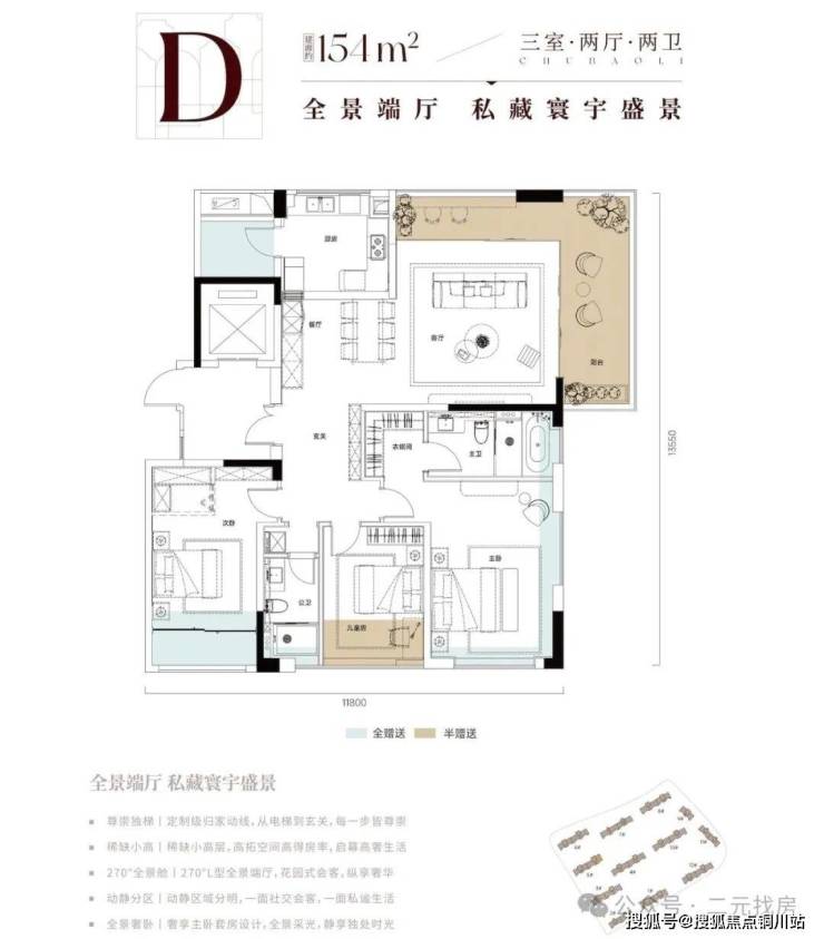 其中,154㎡依旧是三房户型,但客厅做成了270°转角的全景端厅,观景效果比较好,属于当下比较时髦的设计。