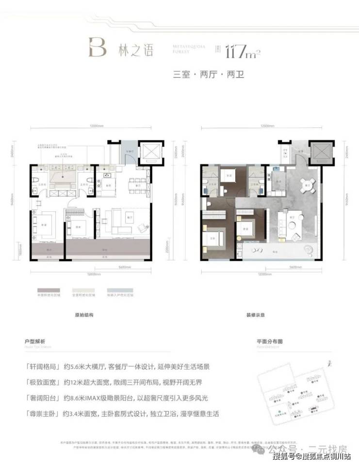 该户型的得房率约99%,南向三开间朝南,南向面宽达到了12米,客厅的面宽达到了5.6米,大小两个阳台带均带有花池,有电梯前室,还有一个可以改造的设备平台。