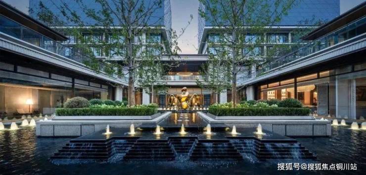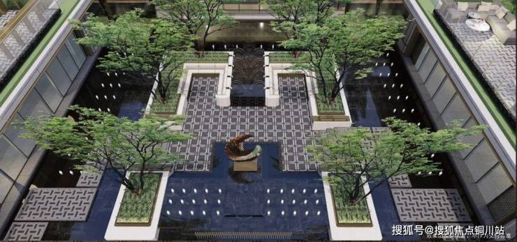 下沉庭院犹如浮岛花园,以鎏金感艺术雕塑为视觉聚焦点,叠加花境植物、古典花坛、阵列涌泉,层层深入构建出舒适平衡的视觉感受。