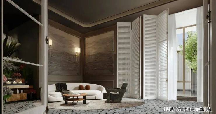 接待厅端景设计灵感来自意大利托斯卡纳花园别墅,夹景的做法,赋予豪宅的自然气息温柔的包裹感,同时融合江南古典园林的框景艺术,东西文化相融。