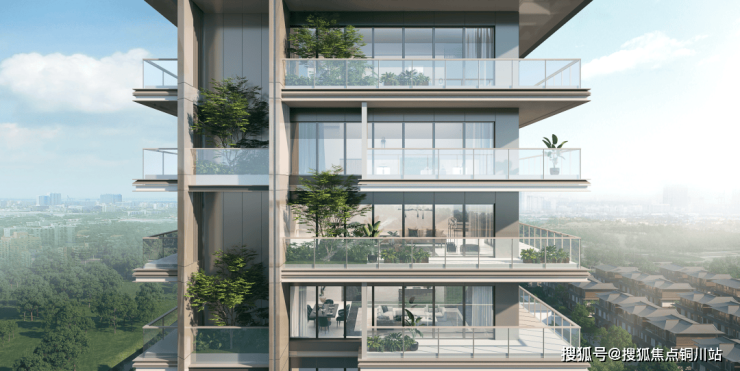 提炼“院落共生”生活理念,情感化场景植入,在庭院中设置“记忆锚点”,比如“一棵来自老家的树”;对于院子进深不足的痛点,通过视觉穿透与功能复合等边界消融策略,近150-300㎡小进深庭院空间获得“倍增”效果;在大平层产品中,通过引进“四代宅”立面理念,在阳台覆土种植立体绿化,打造生长于建筑中的丛林秘境。