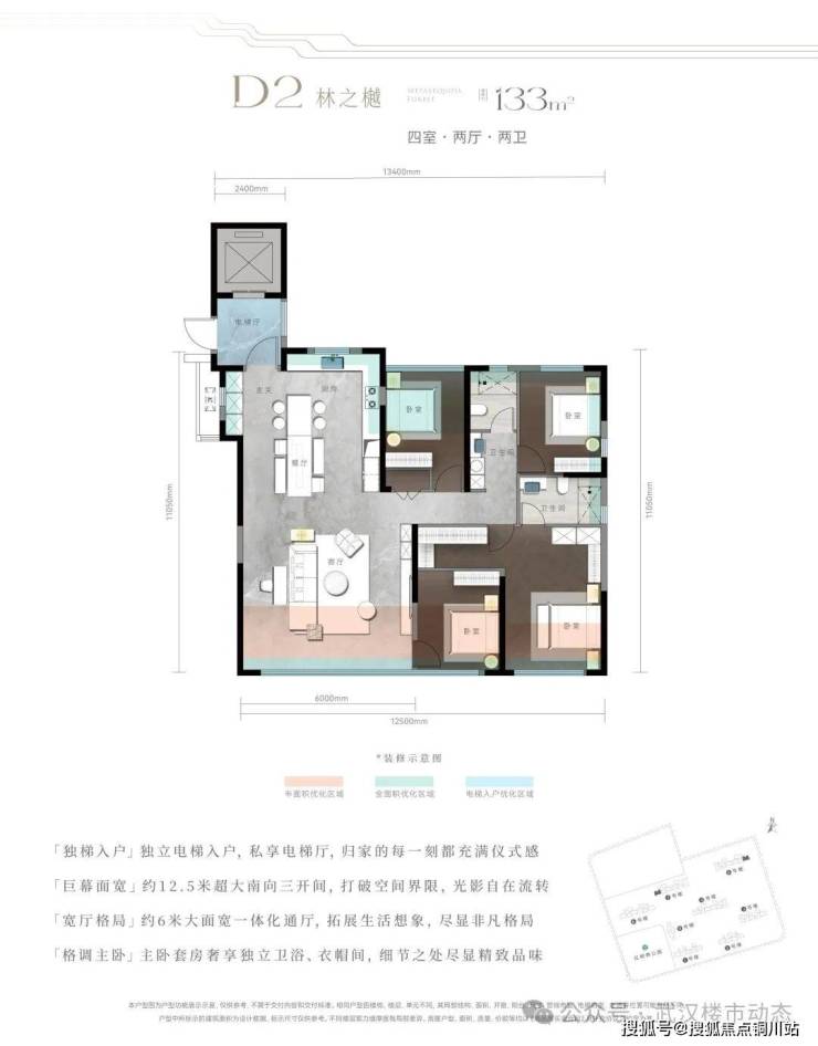 如果说约143㎡是“一步到位”的终极答案,那约133㎡就是“进退自如”的明星选手。这个户型,除了超100%优化后使用率、独立电梯前室、创新型S强设计等“常规操作”之外,空间尺度才是真正的“王炸”。