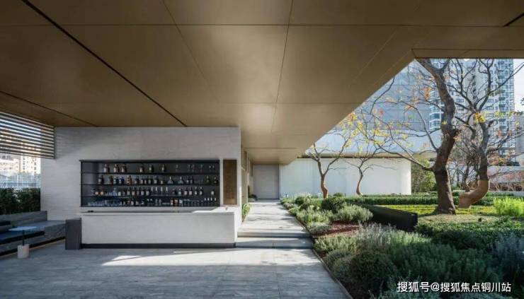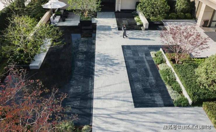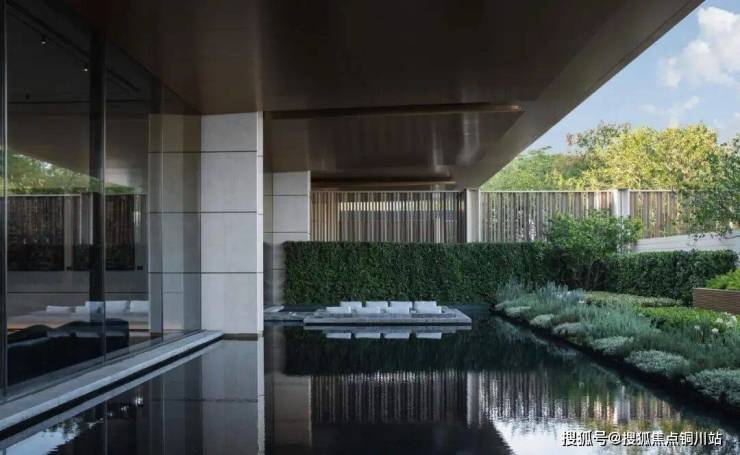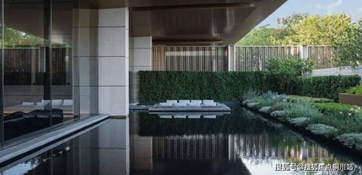 庭院通过水、石、植物构建矩形拼接,自然渗透其中,光影流动间绿意舒展,营造伴水伴林的静谧氛围。