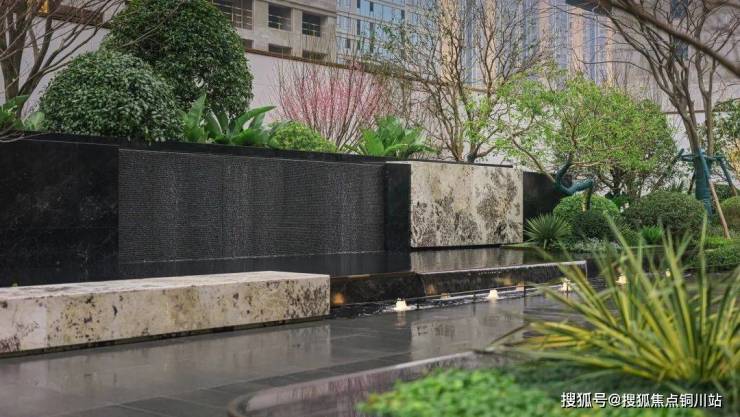 漫步其间,还能看到一片层层跌水的景墙,特型铁冬青斜飘于水面, 让归家之旅就像是在花园中漫游。