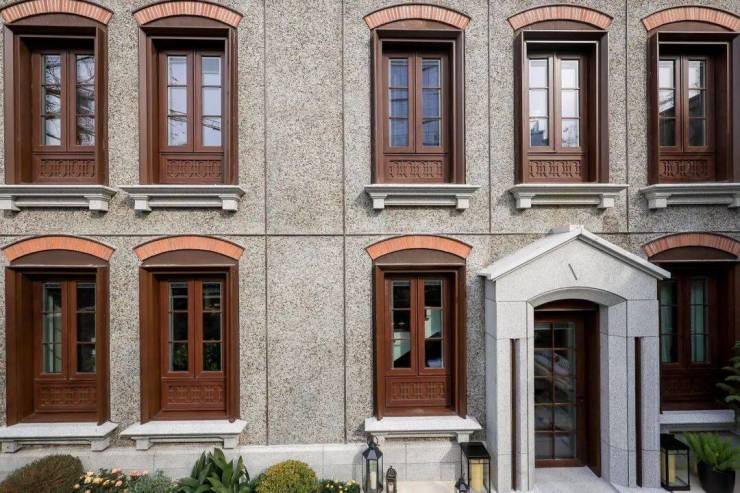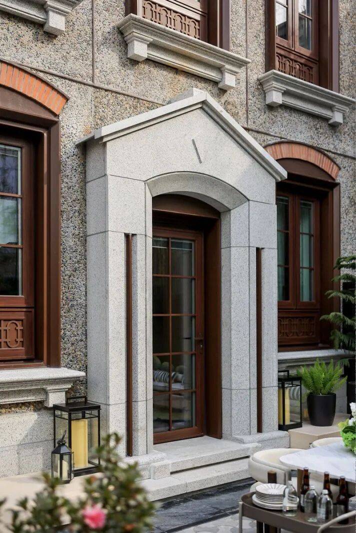 保利外滩序风貌别墅的产品设计中,最引人注目的是其对海派历史风貌的细致复刻与非遗匠艺的当代传承。通过对原有建筑构建元素的提取,复原了老虎窗、红漆木制感方格长窗、拱券门洞等经典构件,并且不同于大多数风貌别墅所常用的青砖与红砖,外滩序参照了思南公馆的立面形态,以手工卵石铺贴工艺为核心,将每块石材以喷砂或水流冲击的精细化处理,由非遗匠人手工打磨至温润如玉的包浆质感。通过细腻的非遗技艺,外滩序沿袭了建筑传统的海派风情,又以超越时代的工艺水准赋予建筑庄重与优雅的气质。