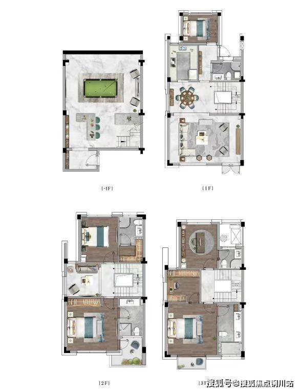 排屋:负一层 5.5 米挑高可改造夹层,形成五层空间;一层设老人房,二层双套房,三层主卧套房,满足三代同堂需求