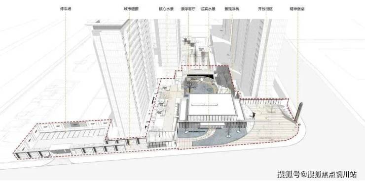 示范区置于场地西南角,界面的退让打造出城市界面开放的街角公园。示范区以街区广场为窗口,以场景营造的方式,让社区与城市相融,共建精神性与功能性的社区场景。