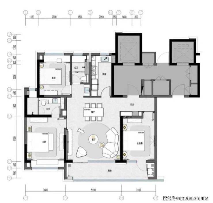 项目用地较为方正,楼宇沿南北方向布置,先顺外围布局再向内,围合出共享大尺度全龄化的社交中央花园,打造宽敞的视线通廊和较为中正的空间格局。90*56M尺寸阔绰的中心的社交花园、运动跑道与颐养,儿童等主题花园营造健康的户外生活方式。11栋约3100㎡的底层架空层打造多样的社区交流平台与邻里空间。