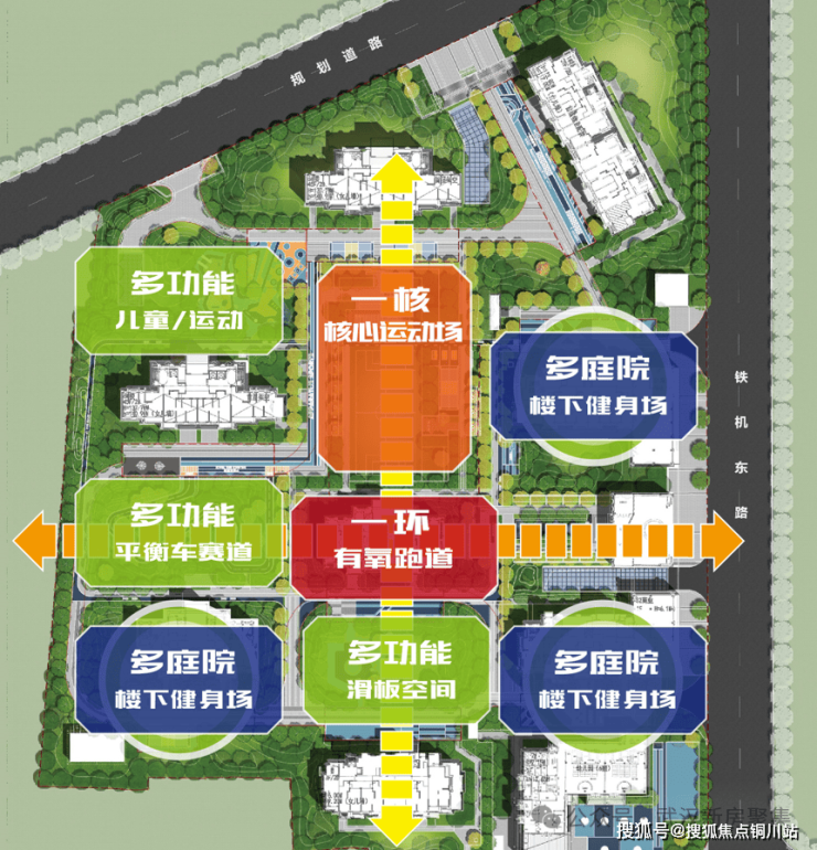 一核:中央超级运动场(五人制足球场、乒乓球场、中央会客厅、林下休闲空间等)