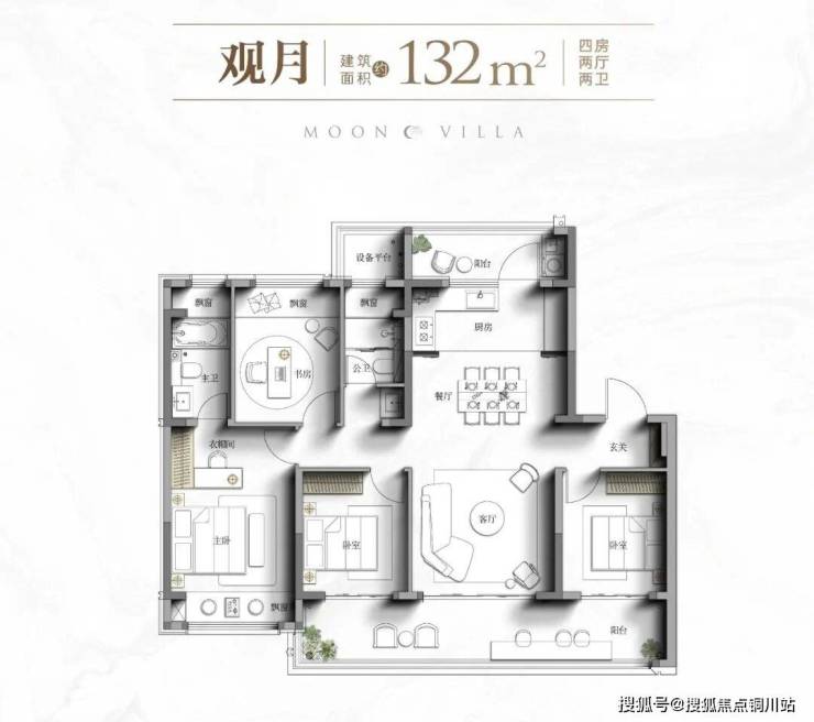 建面约132㎡改善洋房:约13.4米南向面宽,约9.9米贯通式阳台,阳台与飘窗带来近20㎡的拓展空间,使用率超83%。