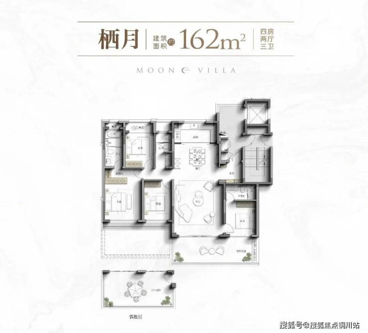 建面约162㎡四代洋房:约21㎡露台与主卧、次卧私密衔接,约14.9米南向面宽、南向双套房格局,独立电梯厅、LDKB一体化布局。