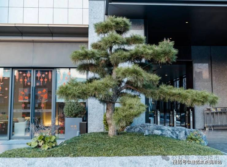 大门左侧的迎客松与造型石相映成趣,寓意着蓬勃的生命力与雅致的东方意趣,右侧的柿子树也有“好事发生”的寓意,这也是对业主的祝福。