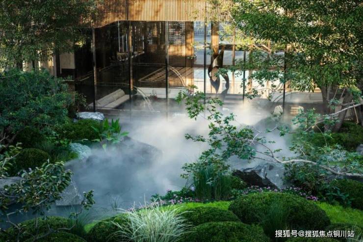 在入户大堂内部的下沉会客厅,项目采用整扇无边界玻璃加以大尺度的香槟金铝板密拼挑檐组成了落客洽谈区,窗外园中“悬瀑园”的高山流水尽收眼底,就此上演生动的“无界山水”。