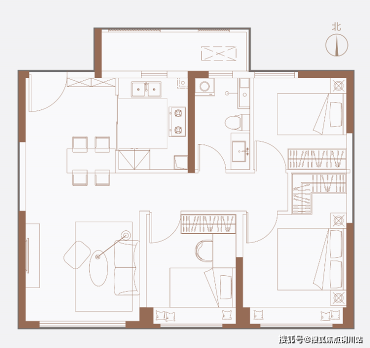 北侧的设备间可根据家庭实际需求,设计为家政设备间或者专属的洗晒空间,保证室内其他空间和谐有序。南侧卧室设有飘窗,集收纳整理与休闲于一体,可与床头柜等家具融合在一起,实现高效利用。