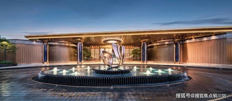 以月季为原型的“海河之月”配合涌泉水景,构成了环岛落客区的中心,长近50米、6米多高的社区大门,搭配约40米的超大星空顶,以奢阔尺度彰显项目品质,整体色调以香槟金为主,贵气十足。