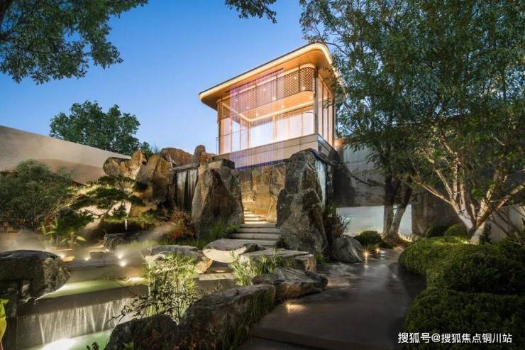项目特邀享誉业界的顶尖设计团队执笔园林景观设计,利用架空层带来的地势高差,打造出约6米高的假山,一座中式凉亭置于假山之上,流水沿亭顶倾泻而下,随即流入山前水潭之中。
