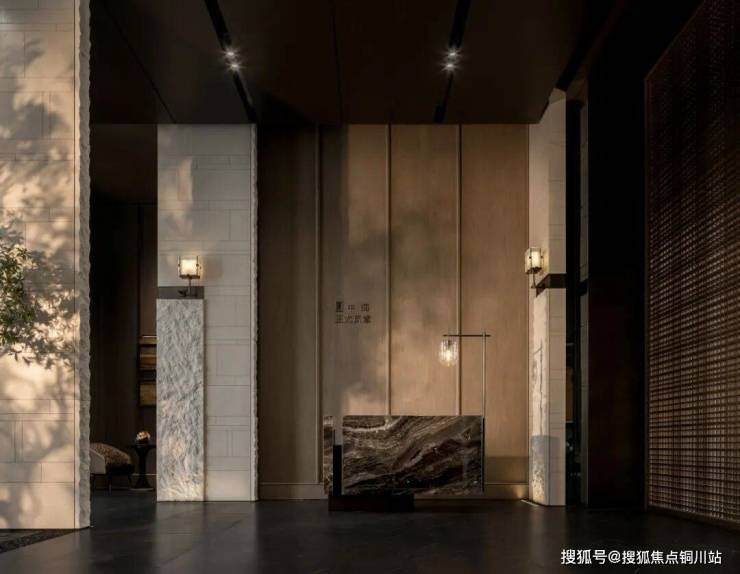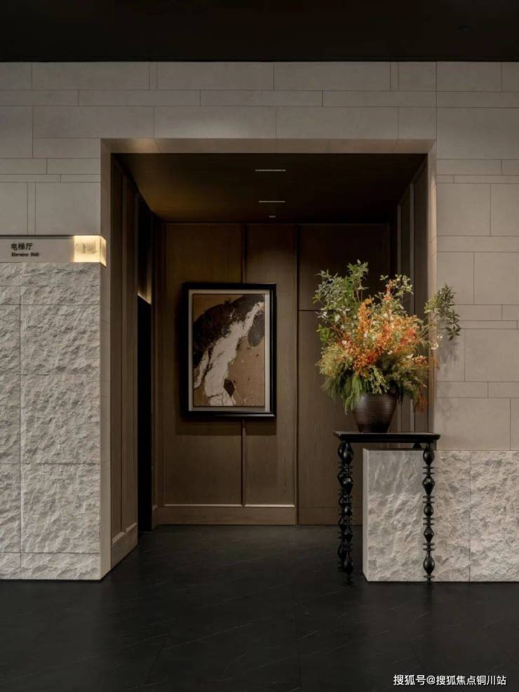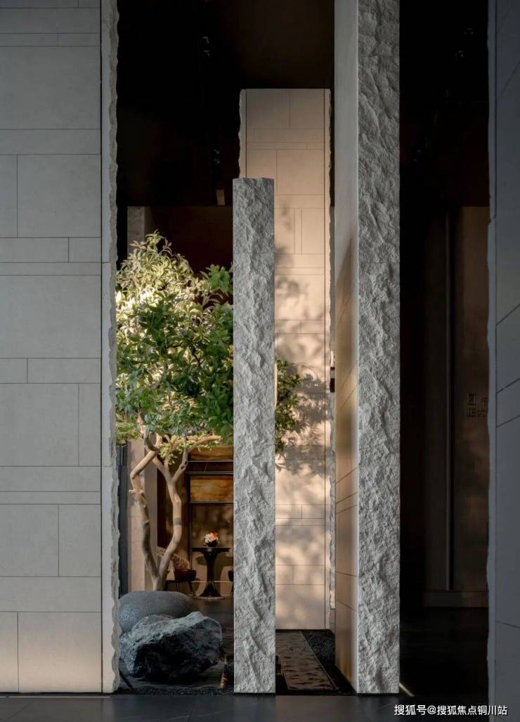 社区大堂位于首层迎宾位置。米色大理石立墙有序排布于空间之中,通过体块的穿插、切割与叠合清晰地界定出功能区域,并围合出一方静谧且富有张力的室内场域。点缀其间的绿植与景石,与石材的原生质感形成对话,共同营造出一处微缩盆景般的自然情境。