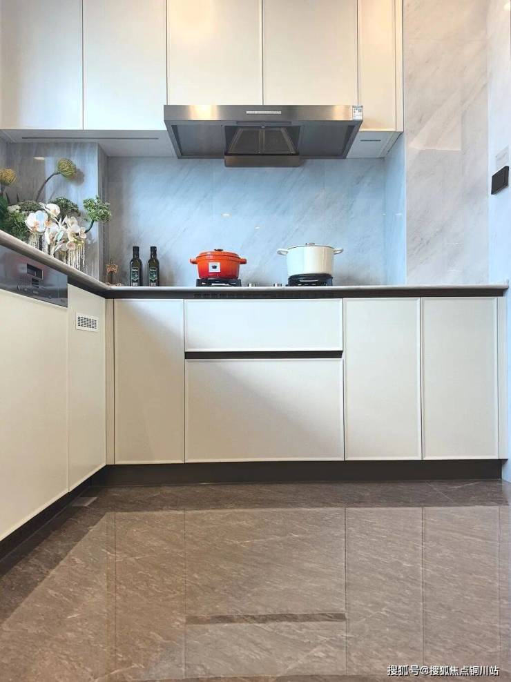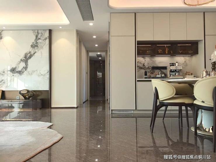 客餐厅及厨房的地面选材,始终秉持严苛标准。选用简一定制款路易灰木纹石材纹理,其纹理与色泽溯源并复刻自苏州绿城最高典藏系列——玫瑰园洋房的原石,完整承袭了该系列的顶级选材标准与奢定基因。如今,这份追求在沁百合得以延续。在<0.5mm密缝连纹效果加持下,极致铺贴工艺让纹理自由延伸,实现浑然一体的石材质感。