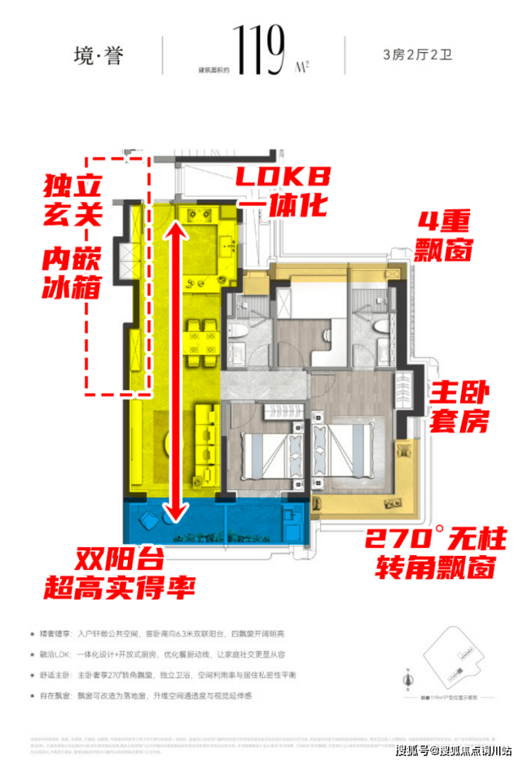 建面约119㎡三房两厅两卫,则在122㎡三房的基础上,进一步强化了生活的舒展度。