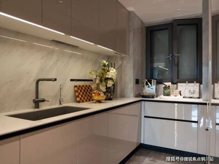 餐客厅一侧创新采用S形墙体设计,可嵌入式安放冰箱,“冰箱外移”让厨房真正被打开。原本中小户型常见的L型厨房,由此升级为更高效的U型布局,操作台面与收纳同步增加,烹饪从功能行为,变成一种更从容的日常。