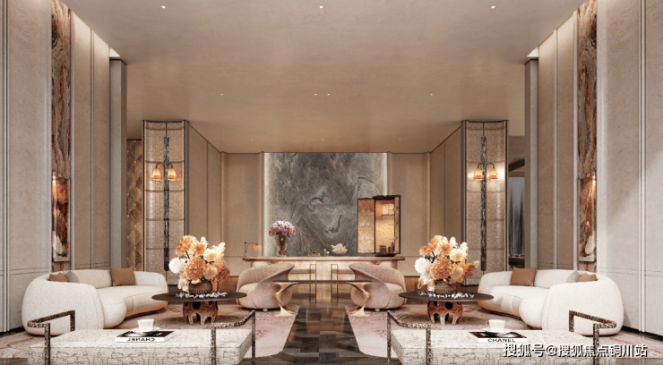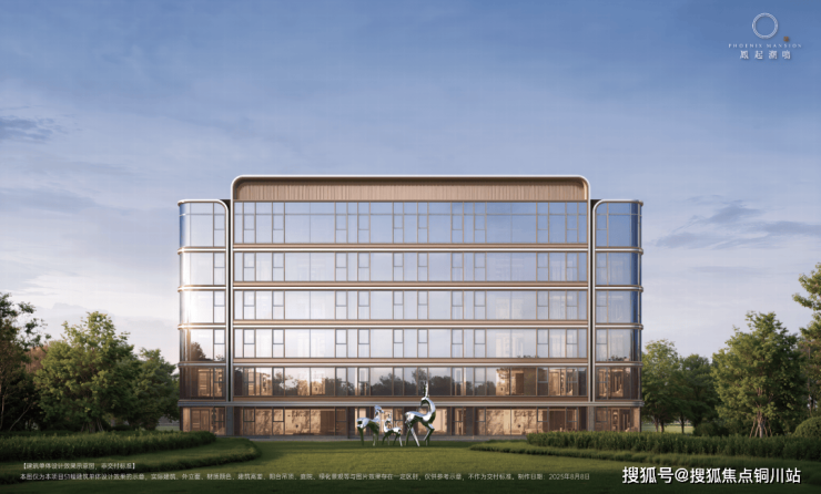 立面以雅灰与鎏金为主色调,搭配凤翎纹铝板与天然石材,在现代设计中融入东方元素,整体轻盈通透而不失厚重质感。